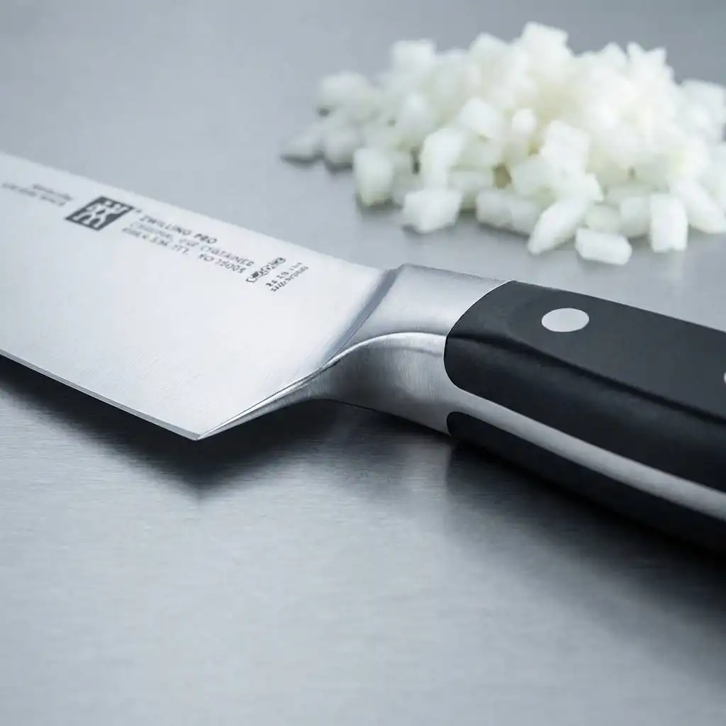 The classic “Four Star” and “Professional S” lines feature a full bolster. This is a thick band of steel that runs all the way down to the heel of the blade. I hate this design. It effectively prevents you from sharpening the last inch of the heel. Over years of sharpening, the blade wears down and recedes, but the bolster does not. Eventually, you end up with a “recurved” profile where the heel hits the cutting board before the rest of the edge, leaving your onions like an accordion—connected at the bottom.