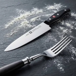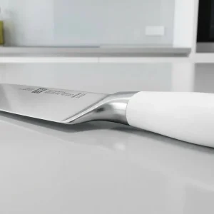 | Thin blade geometry cuts hard vegetables well. | “International” line lacks the fit and finish of German Zwilling. |